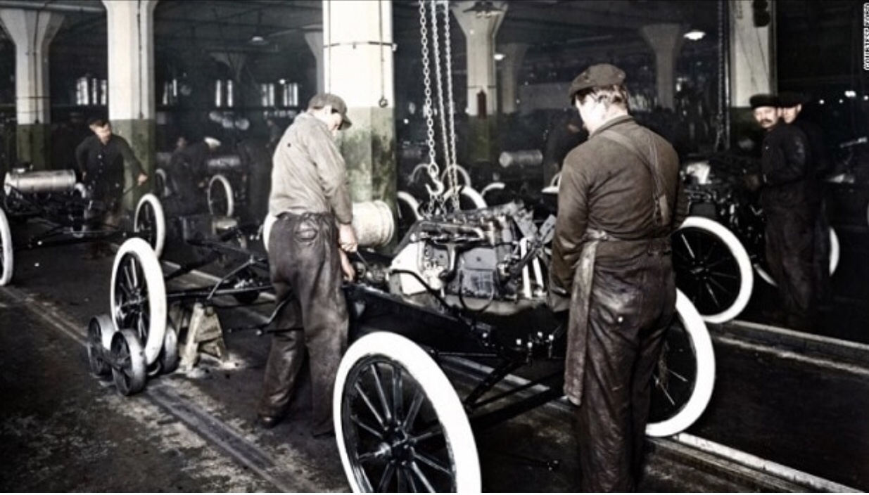 Saat itu, produksi memang sudah menggunakan mesin. Tenaga otot sudah digantikan oleh mesin uap, dan kini tenaga uap mulai digantikan dengan tenaga listrik. Namun, proses produksi di pabrik masih jauh dari proses produksi di pabrik modern dalam satu hal: transportasi. Pengangkutan produk di dalam pabrik masih berat, sehingga macam-macam barang besar, seperti mobil, harus diproduksi dengan cara dirakit di satu tempat yang sama.